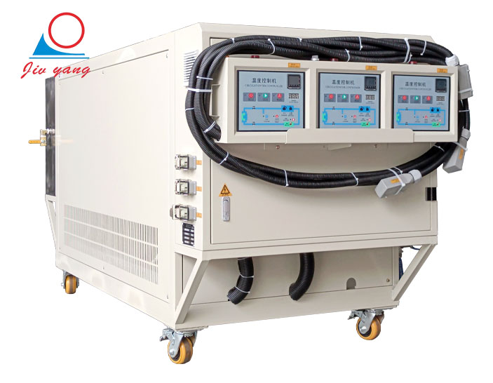 三合一水循环温度控制机又称为三机一体水温机,为定制的大型水式模温机设备,可应用于挤塑机、压延辊筒等需要多个控温过程的工业生产,三合一水温机具备三个独立加热系统,可自定义不同的加热温度,在同个控制端进行调控,并可选择远程操控、远程通讯、联机统一控制等功能,实现集成控制、智能化温控的目的。